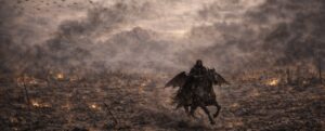 У повітрі повільно кружляло щось біле. Спершу здавалося — сніг. Та коли перша порошина впала на рукав його плаща, він побачив: то був попіл. Попіл від спалених тіл, вичахлих чарів, від усього, що ще кілька годин тому було життям. Він сипався з неба беззвучно, вкриваючи поле тонким брудно-сірим шаром, мов снігопад, що сиплеться з небесної руки смерті.
