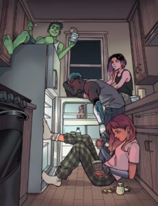 Тільки я відчинив замок — як побачив: Кейт. Вона готує на кухні, хоча виглядає, ніби просто біситься й розкидає все навкруги. Виглядає дуже кумедно: хоч стандартного зросту — для мене вона до грудей, як велика дитина. Дитяче обличчя, кілька веснянок на носі від сонця, виразні брови, коротке волосся, щось схоже на каре, рівний ніс і сірі очі, що вирізняються на фоні всього цього контрасту.