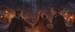 Герміона йшла поруч з Невілом, розпитуючи про пацієнтів і нові випадки, які Луна, як завжди, ретельно записувала до своєї дивакуватої колекції паціентів. Десь уперед уже грала музика, лунав сміх, пісні, і на мить усе здавалося майже мирним. Вона не змогла стримати посмішки — але не через пісні. Серед натовпу вона побачила знайому руду шевелюру, що світилася, немов саме вогнище.